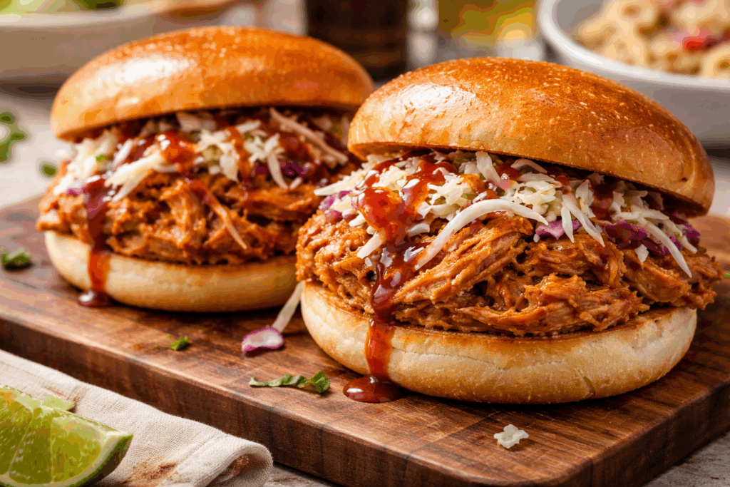 Serveer de pulled chicken op een zacht broodje met coleslaw en een beetje barbecuesaus.